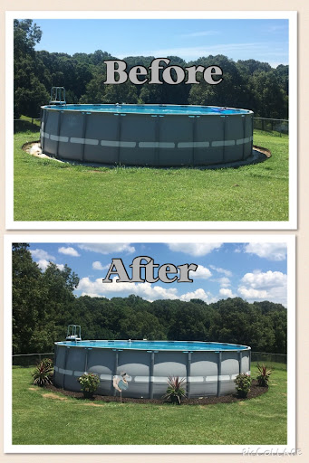 Do not obstruct the view of the pool from the house, for safety reasons. We bought the concrete border from lowe's for $1.77 each and then added some stepping stones around the pool to stand on when cleaning the pool. There are many borders to choose.